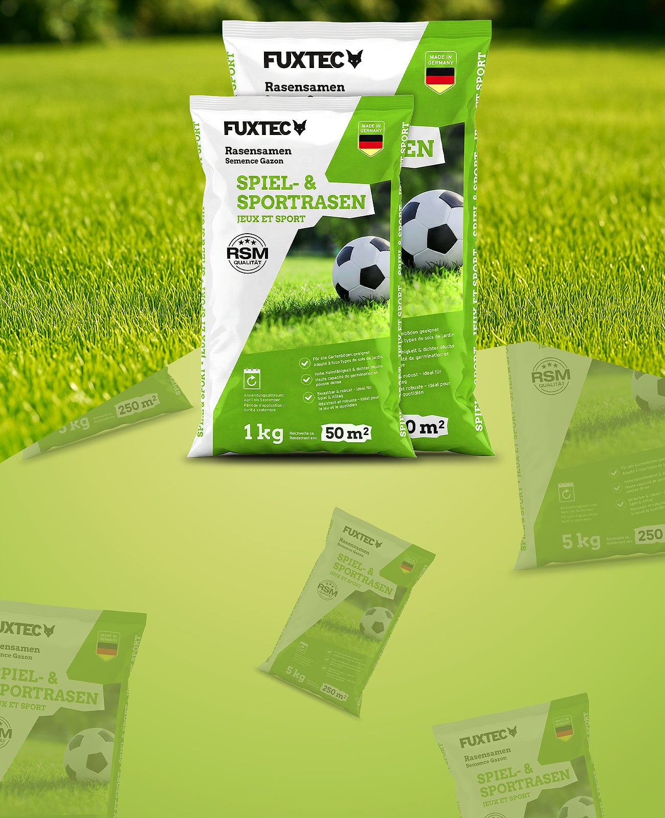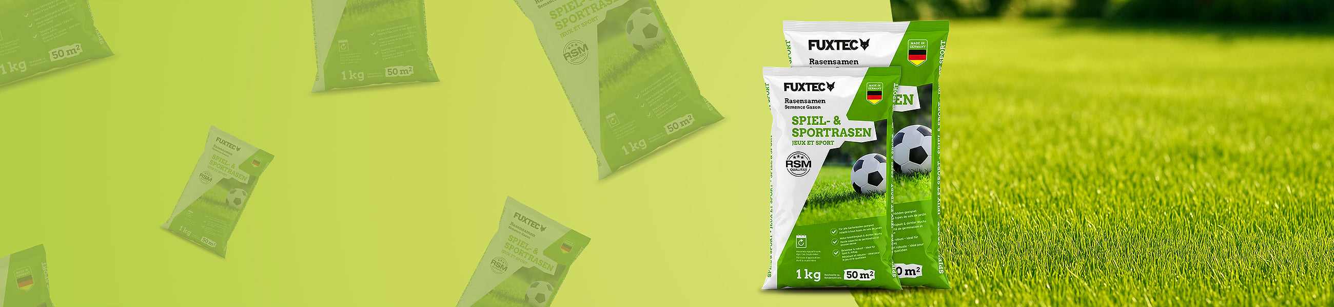 Con i semi per prato FUXTEC trasformi zone spelacchiate e prati ingialliti in un manto erboso fitto, verde e sano.